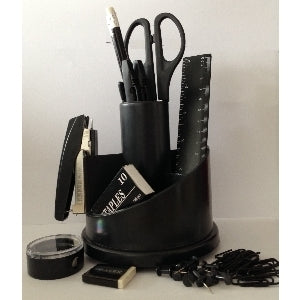Teljesen felszerelt, forgatható, műanyag írószertartó fekete színben.