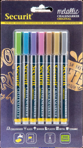 Vonalvastagság: 1-2 mm. A készlet 7db különbőző metál színű krétamarkert tartalmaz (pink, zöld, kék, lila, réz, arany, ezüst). Vízzel, illetve nedves ruhával könnyen lemosható.