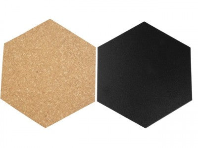 Különleges parafa-és krétatábla készlet, sokféleképp kombinálható hatzögletű táblákból ajándék táblatűkkel és a rögzítéshez kétoldalas ragasztószalaggal.